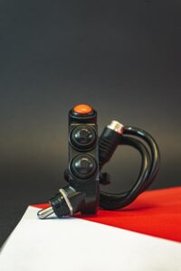 El mando incorpora 3 botones pulsadores y una palanca de 2 posiciones, permitiendo controlar hasta 5 funciones simultáneas dentro de la aplicación. Su diseño está inspirado en los mandos tradicionales de roadbook mecánico, adaptados al mundo de la navegación digital moderna.